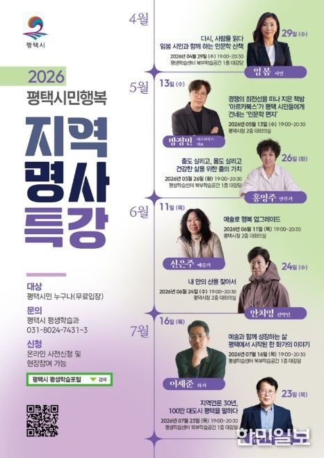 한편 모든 강좌는 4월 20일부터 평택시 평생학습 포털 및 전화로 사전 신청할 수 있으며, 일부 잔여 좌석에 한해 현장 참여도 가능하다. 평택시는 이번 지역 명사 특강을 통해 시민의 지식 성장을 지원하고, 열린 평생학습 문화 조성을 더욱 강화할 계획이다.