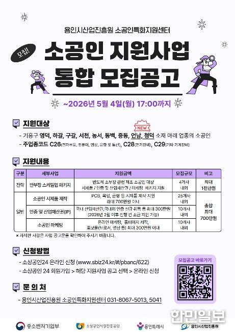 한민일보 서울포커스 김성윤 기자 | 용인시산업진흥원 소공인특화지원센터는 용인시 소재 소공인의 경쟁력 강화를 위해 소공인 지원사업을 본격 추진하고, 참여기업 총 49개사를 모집한다고 밝혔다.