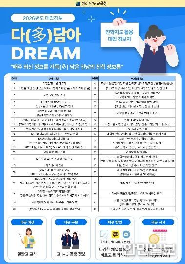 한민일보 서울포커스 임경복 기자 | 전라남도교육청이 급변하는 대입 환경에 선제적으로 대응하고 학교 현장의 진학지도 역량을 강화하기 위해 맞춤형 대입 정보지 ‘다(多)담아 DREAM’을 발간·운영한다.