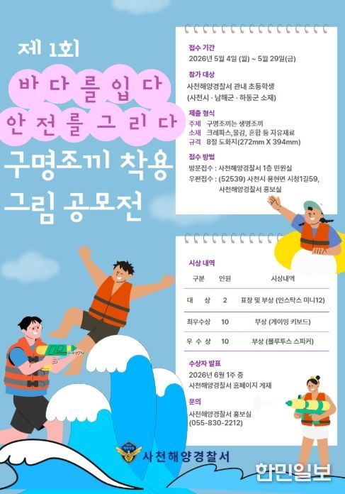 한민일보 서울포커스 김은금 기자 | 사천해양경찰서는 제1회 '바다를 입다 안전을 그리다' 구명조끼 착용 그림 공모전을 개최한다고 20일(월) 밝혔다.