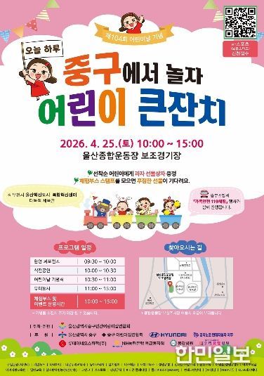 한민일보 서울포커스 기자 | 제104회 어린이날을 기념해 ‘2026년 종갓집 중구 어린이 큰잔치’ 행사가 오는 4월 25일 오전 10시부터 오후 3시까지 울산종합운동장 보조경기장에서 열린다.