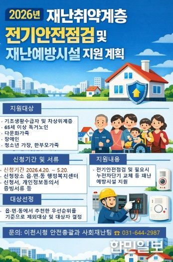 한민일보 서울포커스 박용남 기자 | 이천시는 전기설비 노후화 등으로 인한 화재와 안전사고를 예방하고 재난취약계층의 주거 안전을 강화하기 위해 ‘재난취약계층 전기안전점검 및 재난예방시설 지원사업’을 추진한다고 밝혔다.