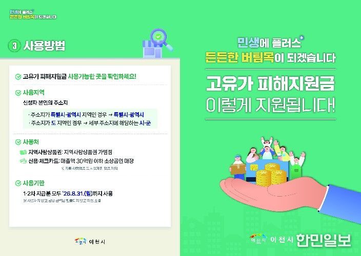 이천시 복지정책과장은 “신속한 지급을 통해 고유가로 어려움을 겪는 시민들의 부담을 덜고, 지역경제 회복에 실질적인 도움이 될 수 있도록 최선을 다하겠다”라고 말했다. 이어 “정부와 카드사, 지역화폐 운영기관은 스미싱 피해 예방을 위해 피해지원금 관련 안내 문자나 사회관계망서비스(SNS)에 링크를 포함해 발송하지 않을 예정”이라며, 관련 문자에 대한 각별한 주의를 당부했다.