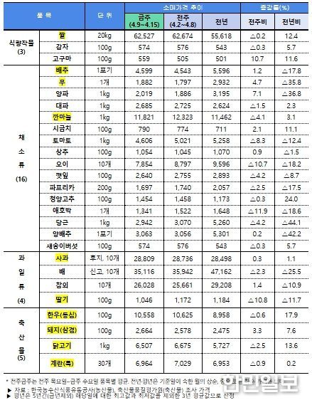 점검 결과, 농산물은 대다수 품목이 전년 대비 낮은 수준이다. 특히, 양파, 양배추, 당근 등 노지채소류는 가격이 큰 폭으로 하락함에 따라 시장격리, 정부 비축물량 출하정지와 함께 소비촉진을 추진하고 있다.
