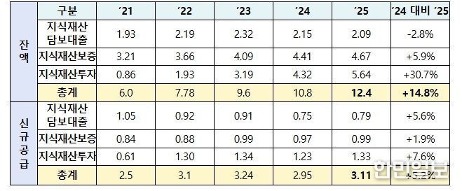 지식재산 금융 잔액은 ’24년 말 10.8조원에서 ’25년 말 12.4조원으로 증가하여 전년대비 14.8% 성장했다. 2025년 지식재산 금융 신규공급은 총 3.1조원으로, 2024년 2.95조원 대비 5.2% 증가했다.