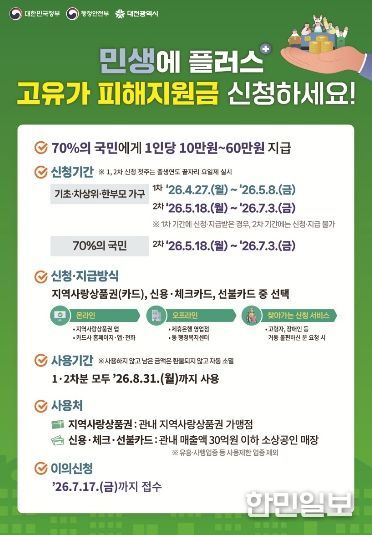 한민일보 서울포커스 김서윤 기자 | 대전시는 국제 유가 상승에 따른 시민 부담을 완화하고 지역경제 안정을 도모하기 위해 고유가 피해지원금 전담 TF를 운영하고, 4월 27일부터 취약계층을 대상으로 1차 신청을 접수한다.