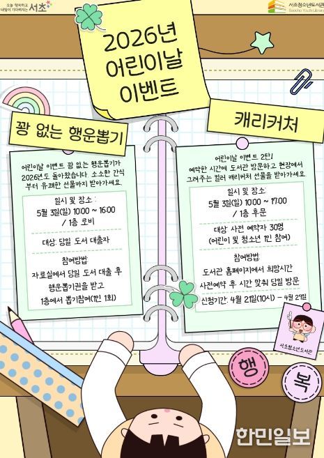 한민일보 서울포커스 곽중희 기자 | 서울 서초구는 다가오는 어린이날을 맞아 다음달 3일 서초청소년도서관에서 어린이와 가족 모두가 즐길 수 있는 특별한 문화 행사를 개최한다. 이용자들을 위한 이벤트를 중심으로 일상 속 친숙한 도서관 만들기의 일환이다.