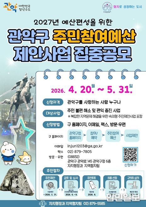 한민일보 서울포커스 곽중희 기자 | 관악구가 지역사회 문제를 해소하고 주민 편익을 증진하기 위해 ‘2026년도 주민참여예산사업 및 협치의제’ 공모를 실시한다.