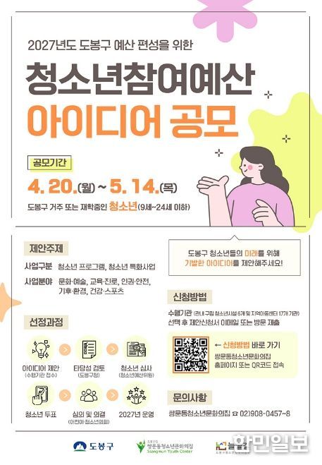 한민일보 서울포커스 김봉순 기자 | 서울 도봉구가 ‘청소년참여예산제’ 아이디어 공모를 오는 5월 14일까지 진행한다.