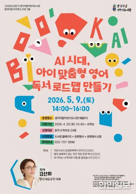 한민일보 서울포커스 임경복 기자 | 원주시 생각자람어린이도서관은 다음 달 9일 오후 2시, ‘AI 시대, 아이 맞춤형 영어 독서 로드맵 만들기’를 주제로 5월 ‘함께자람 부모학교’ 프로그램을 운영한다.