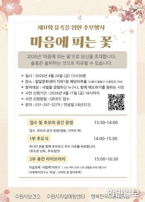 한민일보 서울포커스 진광성 기자 | 수원시자살예방센터가 24일 오후 1시 30분 팔달문화센터 예당마루홀에서 유족을 위한 추모행사 ‘제11회 마음에 피는 꽃’을 연다.