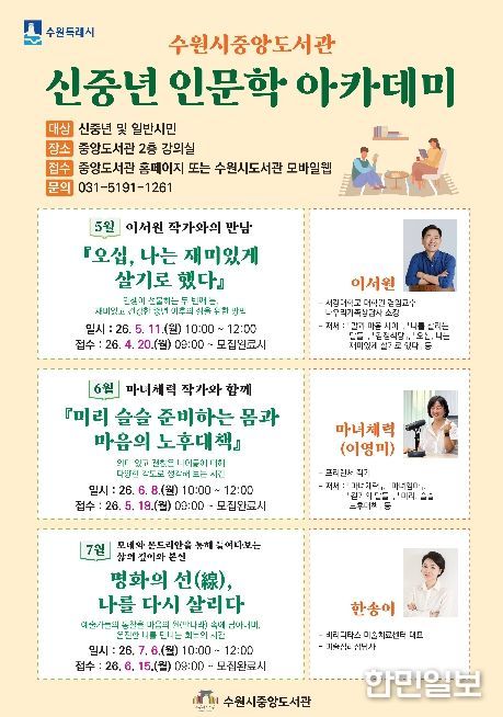 한민일보 서울포커스 진광성 기자 | 수원시 중앙도서관이 5월부터 7월까지 매달 1회 운영하는 ‘신중년 인문학 아카데미’ 수강생을 모집한다.