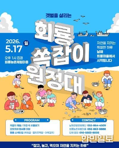 한민일보 서울포커스 김서윤 기자 | 남해관광문화재단은 ‘2026 지역민 주도 소규모 축제 개최 지원 사업’의 일환으로 오는 5월 17일 일요일 오후 1시 ‘갯벌을 살리는 회룡 쏙잡이 원정대’ 축제를 개최한다.