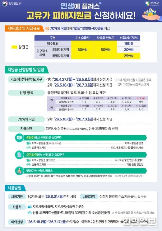 한민일보 서울포커스 임경복 기자 | 강진군이 최근 중동사태 등으로 지속되는 고유가 상황에 대응해 군민 생활 부담 완화를 위한 ‘고유가 피해지원금’을 지급한다.
