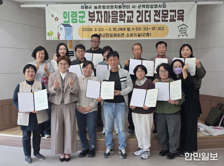 한민일보 서울포커스 김은금 기자 | 의령군은 지난 3월부터 추진해 온 ‘2026년 부자마을학교 리더 전문교육’을 마무리하고 12명의 수료생을 배출했다고 밝혔다.
