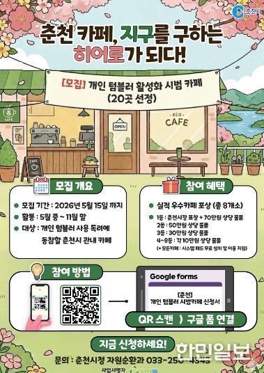 모집 기간은 5월 15일까지다. 선정된 카페는 5월 중순부터 11월 말까지 약 6개월간 시범사업에 참여하게 된다. 참여 대상은 개인 텀블러 사용 권장 등 친환경 실천에 동참할 의사가 있는 춘천시 지역 내 카페다.