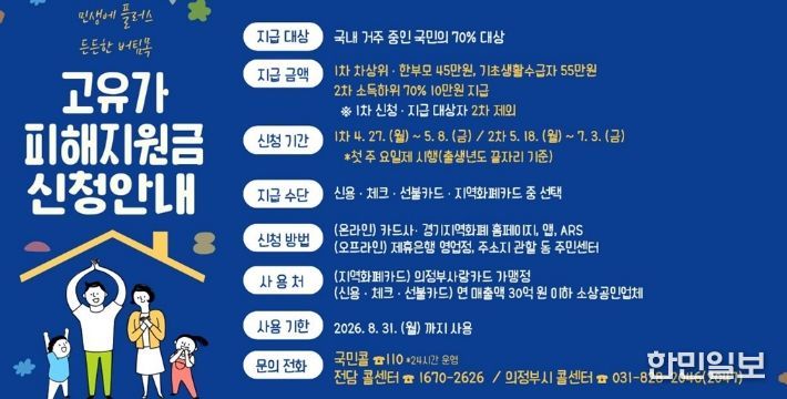 한민일보 서울포커스 심기옥 기자 | 의정부시는 중동전쟁으로 촉발된 고유가‧고물가로 인한 국민 부담을 경감하고자 ‘고유가 피해지원금’ 신청을 4월 27일부터 접수한다.