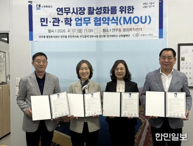 한민일보 서울포커스 진광성 기자 | 수원시 장안구 연무동 행정복지센터와 주민자치회, 반딧불이연무시장상인회, 경기대학교 산학협력단은 지난 17일, 각 기관의 긴밀한 상호 협력과 유대관계 강화를 위한 업무협약을 체결했다.