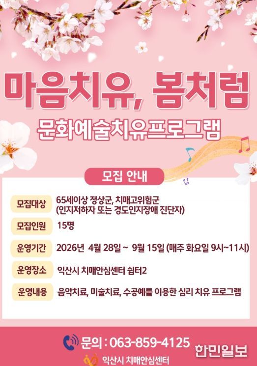 한민일보 서울포커스 김용택 기자 | 익산시는 보건소 치매안심센터에서 고령층 문화예술 치유프로그램 '마음치유, 봄처럼' 참여자 15명을 선착순으로 모집한다고 21일 밝혔다.