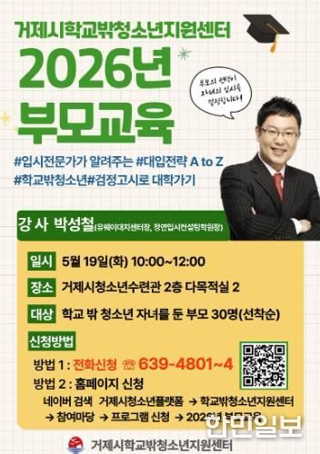 한민일보 서울포커스 김은금 기자 | 거제시학교밖청소년지원센터에서는 5월 19일 학교 밖 청소년 자녀를 둔 부모를 대상으로'2026년 학교 밖 청소년 부모교육'을 실시한다고 밝혔다.