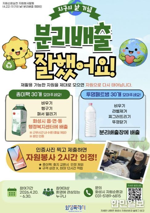 한민일보 서울포커스 진광성 기자 | 화성특례시가 2026년 ‘지구의 날(4월 22일)’을 맞아 시민들이 일상 속에서 환경 보호를 실천할 수 있는 자원봉사 활동 '분리배출 잘했어요' 캠페인을 운영한다고 밝혔다.