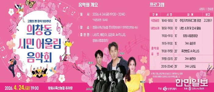 한민일보 서울포커스 김서윤 기자 | 창원특례시는 오는 24일 19시 창원시축산농협 주차장(의창구 중동 402-2)에서 ‘의창동 시민 어울림 음악회’를 개최한다고 밝혔다.