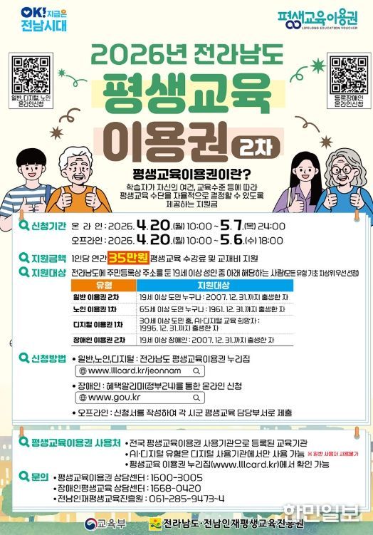 한민일보 서울포커스 임광현 기자 | 여수시는 시민의 자기계발과 자아실현을 지원하기 위해 ‘제2차 평생교육이용권’ 참여자를 모집한다고 밝혔다.
