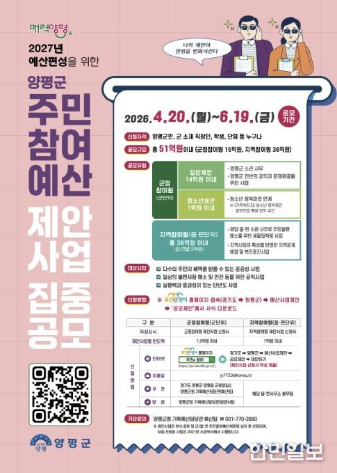 한민일보 서울포커스 차재만 기자 | 양평군은 오는 6월 19일까지 2027년 예산에 반영할 ‘주민참여예산 제안사업’을 집중 공모한다고 밝혔다.