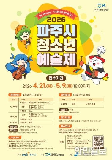 한민일보 서울포커스 진광성 기자 | (재)파주시청소년재단 금촌청소년문화의집은 오는 4월 21일부터 5월 9일까지 ‘2026 파주시청소년예술제’ 참가자를 모집한다고 밝혔다. 올해‘Be Happy, 무대위에 피어나다’를 부제로 개최되는 이번 예술제는 제34회 경기도청소년예술제 파주시 공식 예선으로, 파주시 청소년이라면 누구나 참가 신청이 가능하다.