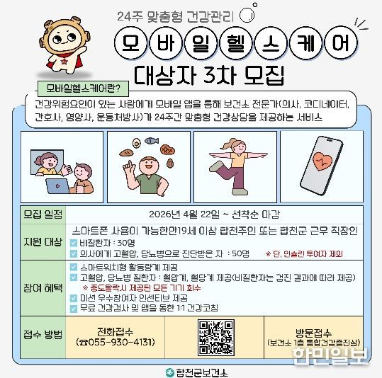 한민일보 서울포커스 김은금 기자 | 합천군보건소(소장 안명기)는 22일부터 모바일헬스케어 대상자 3차 모집을 시작한다.