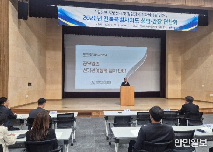 한민일보 서울포커스 박용남 기자 | 전북특별자치도 감사위원회는 공직자의 정치적 중립의무 준수와 공직기강 확립을 위해 21일 전북테크비즈센터 대강당에서 도와 14개 시군, 산하기관 감사 담당자들을 대상으로 ‘청렴·감찰 연찬회’를 개최했다.