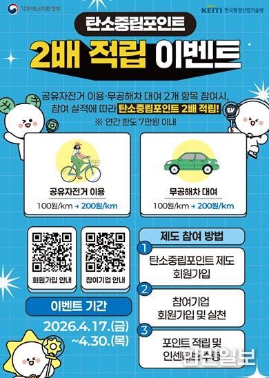 이벤트 기간은 4.17. ~ 4.30.까지 14일간이며, 해당기간에는 탄소중립포인트를 기존 100원/km에서 200원/km으로 2배 받을 수 있다. 다만 1인당 받을 수 있는 연간 7만원 한도는 변함이 없다.