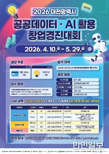 한민일보 서울포커스 김서윤 기자 | 대전시는 공공데이터와 인공지능(AI)을 기반으로 지역사회 현안을 해결할 창의적인 아이디어와 혁신적인 비즈니스 모델을 발굴·지원하기 위해‘2026년 대전광역시 공공데이터·AI 활용 창업경진대회’를 개최한다.