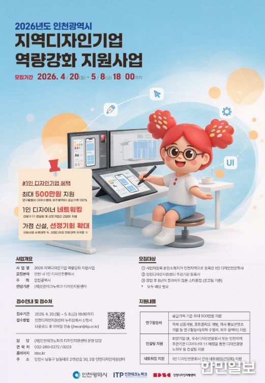 한민일보 서울포커스 유창렬 기자 | 인천테크노파크(인천TP)는 오는 5월 8일까지 지역 디자인 산업의 경쟁력 강화를 위한 ‘2026 지역디자인기업 역량강화 지원사업’에 참여할 1인 디자인기업을 모집한다고 밝혔다.