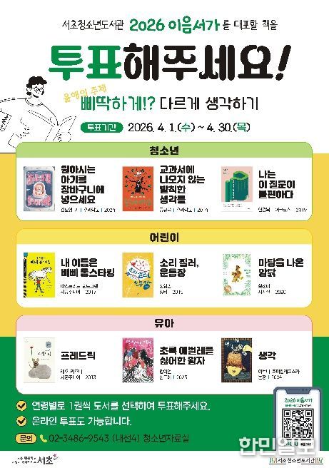 한민일보 서울포커스 곽중희 기자 | 서울 서초구 서초청소년도서관은 주민과 한 권의 책을 선정해 함께 읽고 생각과 경험을 나누는 ‘2026 서청도 한 책 : 이음서가’ 운영을 위해 이달 말까지 올해의 대표 도서 선정 투표를 진행한다.