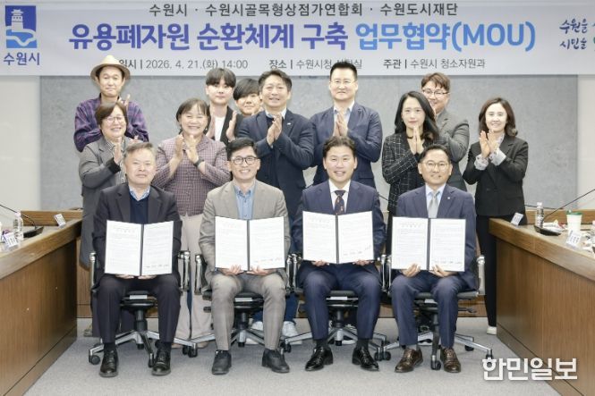 수원시는 21일 시청 상황실에서 수원시골목형상점가연합회, 수원도시공사, 수원도시재단과 ‘유용 폐자원 순환 체계 구축 업무협약’을 체결하고, 협력을 약속했다.