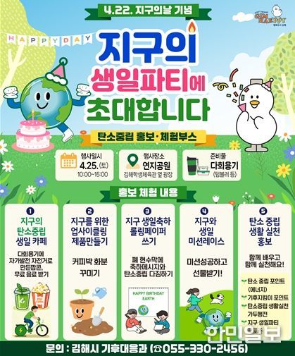 한민일보 서울포커스 김은금 기자 | 김해시는 지구의 날(4.22)을 기념한 제18회 기후변화주간을 맞아 오는 25일 오전 10시부터 오후 3시까지 연지공원에서 탄소중립 체험 행사‘지구의 생일파티에 초대합니다’를 운영한다고 22일 밝혔다.