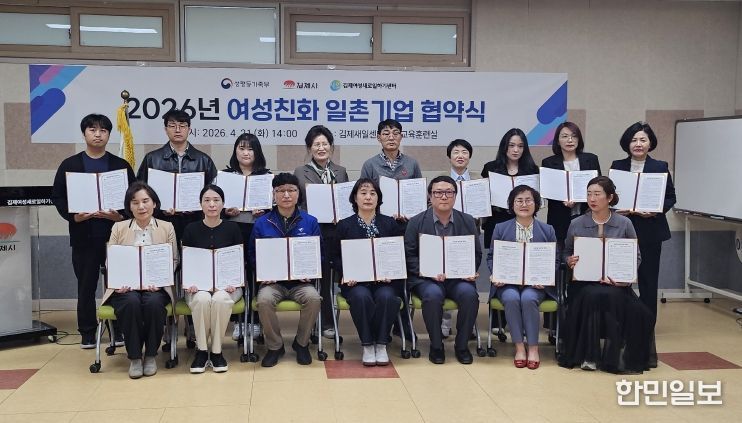 한민일보 서울포커스 박용남 기자 | 김제시여성새로일하기센터는 지난 21일 새일센터 직업훈련실에서여성 취업자의 고용 유지 지원 등을 위한 지역 업체와의 협력망 구축을 위해'2026년 여성친화 일촌기업 협약식'을 개최했다고 밝혔다.