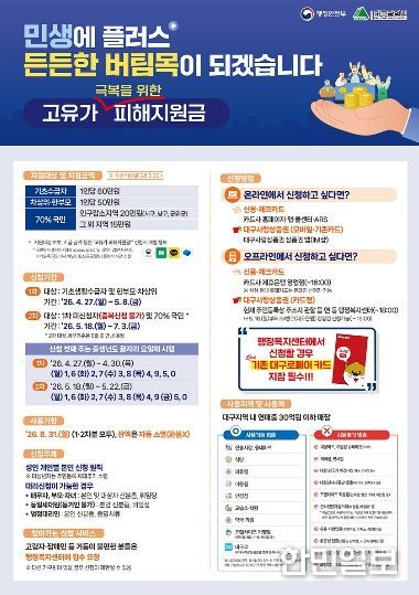 김정기 대구광역시장 권한대행 행정부시장은 “중동전쟁으로 인한 고유가·고물가로 지역경제 소비심리가 크게 위축됐다”며 “민생 안정이 최우선인 만큼, 시민분들께서 신청 단계부터 지급·사용까지 불편함이 없도록 만반의 준비를 다하겠다”고 말했다.