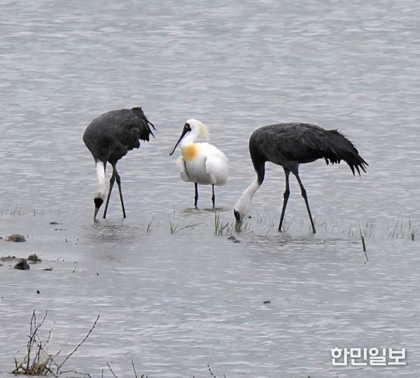 한민일보 서울포커스 박용남 기자 | 지난 20일 순천만 복원습지에서 겨울철새인 흑두루미 한 쌍과 여름철새인 저어새가 한 장면에 포착됐다.