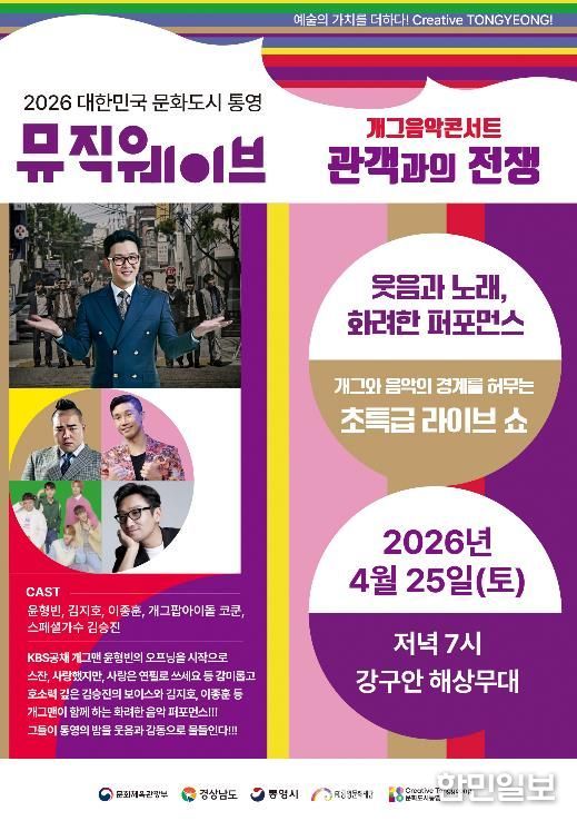 한민일보 서울포커스 김서윤 기자 | (재)통영문화재단은 오는 25일 오후 7시 강구안 해상무대에서 2026년 뮤직웨이브 정기공연으로 음악과 개그의 경계를 허무는 특급 라이브쇼 개그음악콘서트 ‘관객과의 전쟁’공연을 진행한다.