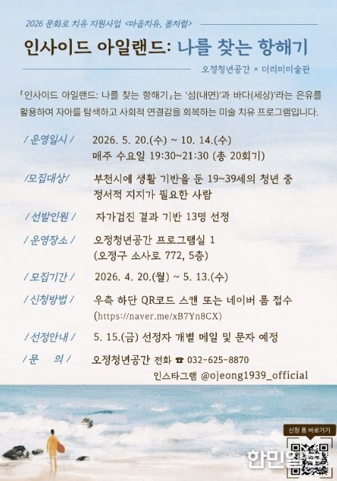 한민일보 서울포커스 김윤이 기자 | 부천시는 오정청년공간에서 정서적 고립감을 겪는 청년을 위한 미술 치유 프로그램 ‘인사이드 아일랜드: 나를 찾는 항해기’ 참여자를 5월 13일까지 모집한다.