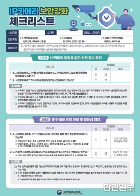 한민일보 서울포커스 기자 | 개인정보보호위원회는 지난해 12월 관계부처 합동으로 발표한 'IP카메라 보안 관리체계 고도화 방안'의 후속 조치로 관계부처, 지자체, 주요 직능단체 등과 함께 ‘IP카메라 보안 강화를 위한 민관협력 캠페인’을 추진한다.