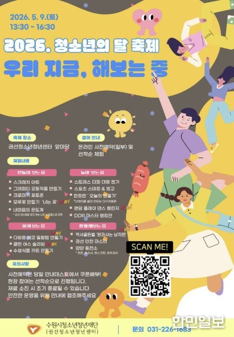 한민일보 서울포커스 진광성 기자 | 수원시청소년청년재단 권선청소년청년센터가 오는 5월 9일, 청소년이 주인공이 되어 직접 경험하고 도전하는 참여형 축제 ‘지금우리, 해보는중’을 개최한다고 밝혔다.