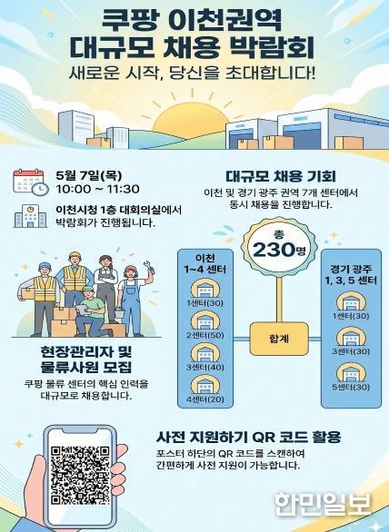 이번 박람회는 이천 및 경기 광주 권역 7개 센터가 참여해 총 230명 규모의 인력을 채용하는 행사로, 현장관리자 및 물류사원 등을 모집할 예정이다. 구직자들은 현장에서 채용 정보 제공과 상담을 받을 수 있으며, 포스터 하단 큐알(QR)코드를 활용한 사전 지원도 가능하다.