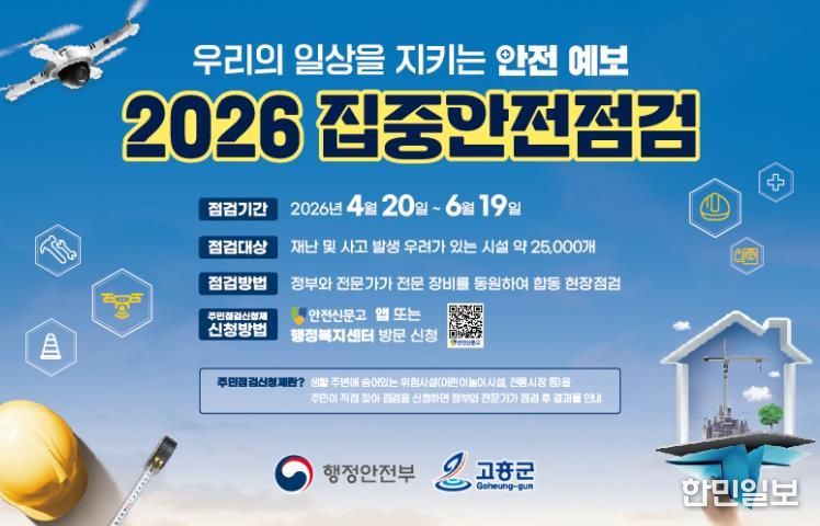 한민일보 서울포커스 임광현 기자 | 고흥군은 재난과 안전사고 예방을 위해 4월 20일부터 6월 19일까지 2개월간 ‘2026년 집중안전점검’을 실시한다고 밝혔다.