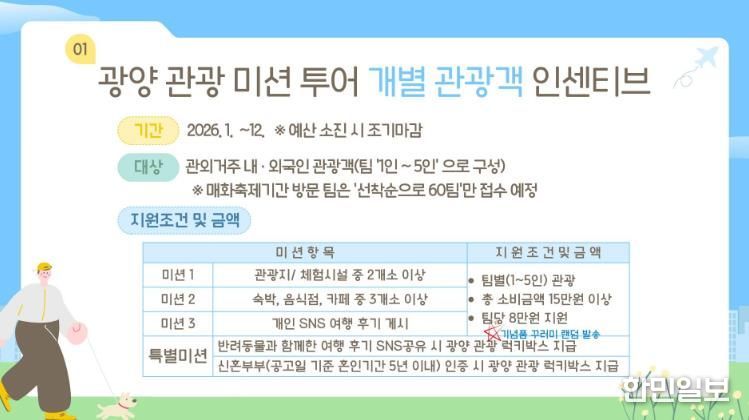 광양관광 인센티브는 기업 연수·회의 등 마이스(MICE)를 포함한 단체관광, 윤동주 테마관광, 개별 미션투어 등으로 구성돼 여행 형태에 따라 선택해 이용할 수 있다.