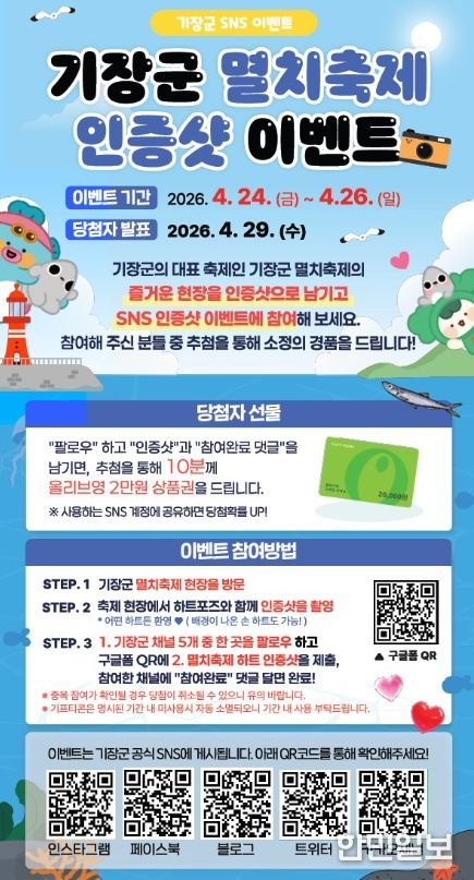 이번 이벤트는 기장군을 대표하는 축제인 기장멸치축제를 찾는 관광객들이 보다 즐겁게 축제를 체험하고, 기장군 공식 SNS 채널을 통해 군정 소식을 보다 친근하게 접할 수 있도록 기획됐다.