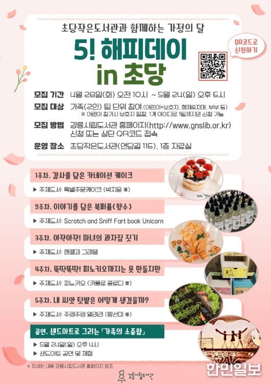 한민일보 서울포커스 임경복 기자 | 강릉시립도서관은 초당작은도서관에서 가정의 달을 맞아 온 가족이 함께 참여할 수 있는 특별 프로그램 ‘5! 해피데이 in 초당’을 운영한다.
