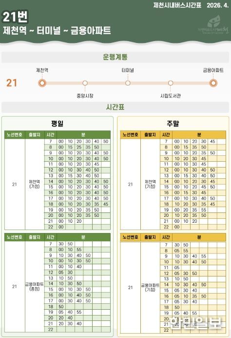 바뀐 시간표는 제천시청 누리집에서 내려받아 활용할 수 있다. 정류장 부착용 시간표 교체는 예산 확보와 인쇄 및 설치 일정 조율을 거쳐 이용객이 많은 주요 거점 정류장부터 순차적으로 진행할 예정이다.